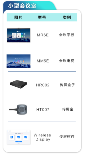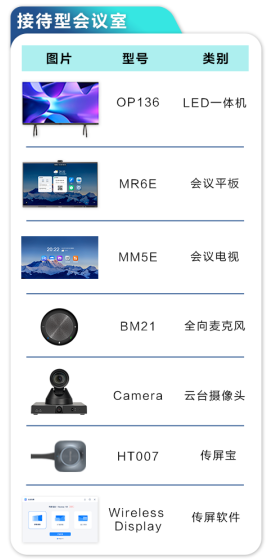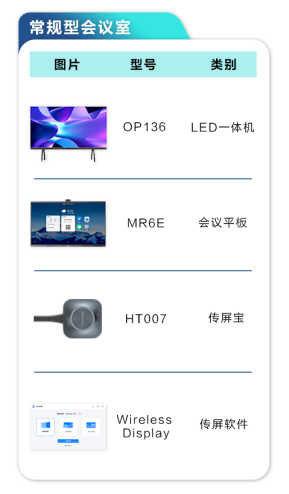 根據(jù)會(huì)議空間及需求不同,還可以自由選擇不同顯示設(shè)備、音視頻設(shè)備、傳屏設(shè)備進(jìn)行自由搭配,生成個(gè)性化方案清單。