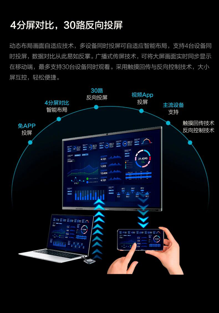 支持Type-C免驅投屏及Miracast、Airplay等主流協議,無論是筆記本電腦、手機還是平板,均可實現“一鍵秒投”,毫秒之間快速將內容同步至大屏,讓討論焦點回歸內容本身。