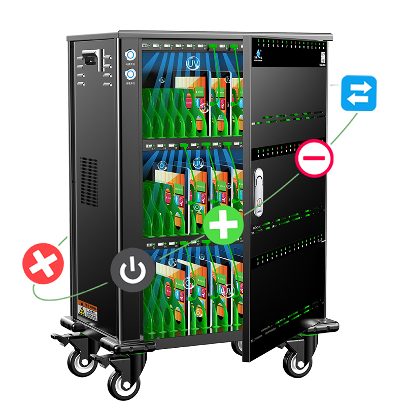 產(chǎn)品詳細(xì)介紹品牌:際慶科技 型號(hào):SYNC48 Sync 48 招投(應(yīng)標(biāo))參數(shù): 功能參數(shù): 1、48口直流充電USB 5V2.4A且每口穩(wěn)定兼容HUB數(shù)據(jù)傳輸功能并對(duì)應(yīng)配48條綠色數(shù)據(jù)線(xiàn)(充電IC芯片智能識(shí)別平板、手機(jī)等設(shè)備所需要的電流,安全、穩(wěn)定、高效); 2、★每口獨(dú)立充電并具備智能LED轉(zhuǎn)燈功能(紅燈:充電狀態(tài) 中,綠燈:充滿(mǎn)/未連接),且有對(duì)應(yīng)的數(shù)字序號(hào); 3、★金屬按鈕開(kāi)關(guān),可過(guò)15A以上大電流,兼具電源開(kāi)關(guān)和通電指示功能,單120mm風(fēng)扇,搭配智能溫控系統(tǒng),30℃±8自動(dòng)啟停; 4、★主動(dòng)式PEC節(jié)能開(kāi)關(guān)電源,柜內(nèi)置十重安全保護(hù)①雷擊保護(hù)②浪涌保護(hù)③過(guò)載保護(hù)④漏電保護(hù)⑤隔離保護(hù)⑥過(guò)流保護(hù)⑦過(guò)壓保護(hù)⑧短路保護(hù)⑨過(guò)充保護(hù)⑩灌流保護(hù); 5、★自動(dòng)消毒功能,紫外線(xiàn)+臭氧O₃雙重消毒,搭配金屬按鈕開(kāi)關(guān),啟動(dòng)25min后自動(dòng)關(guān)閉(選配項(xiàng)); 6、★定時(shí)充電具有電子顯示屏/多組設(shè)置/精準(zhǔn)定時(shí)/倒計(jì)時(shí)設(shè)置(根據(jù)使用習(xí)慣隨意設(shè)定啟停時(shí)間段)(選配項(xiàng)); 7、★支持?jǐn)?shù)據(jù)同步功能,能批量一鍵安裝和卸載APP,支持文件分發(fā)、文件刪除、一鍵關(guān)機(jī)等智能化管控,監(jiān)測(cè)設(shè)備實(shí)時(shí)充電狀態(tài)和電量等(選配項(xiàng))。 結(jié)構(gòu)參數(shù): 1、★外形尺寸≤582*830*358mm(含腳輪、防撞角),工位容積為320*200*25mm ,頂邊圓弧(≥R8)設(shè)計(jì); 2、★兩側(cè)設(shè)有ABS工程提手,柜體四個(gè)底角加裝凸高15mm軟塑防撞角,配裝 4個(gè)3寸帶剎車(chē)天然橡膠靜音腳輪(高度105mm); 3、★三層式全黑16(每層)工位設(shè)計(jì),配裝ABS綠色隔斷,單開(kāi)前門(mén)鎖,左側(cè)艙為電源管控封閉區(qū); 4、★門(mén)板透明視窗部分與內(nèi)部充電LED燈一一對(duì)應(yīng),且有相應(yīng)的數(shù)字序號(hào),前門(mén)板與側(cè)板設(shè)有對(duì)流孔,通風(fēng)散熱。 產(chǎn)品資質(zhì): ①★整機(jī)CCC認(rèn)證(原廠(chǎng)蓋章證明) ②★具有商標(biāo)(國(guó)際分類(lèi)20和9)證書(shū)(原廠(chǎng)蓋章證明) ③★具有軟件著作權(quán)(原廠(chǎng)蓋章證明) ④★具有ISO9001:2015質(zhì)量管理體系認(rèn)證(原廠(chǎng)蓋章證明) ⑤★具有產(chǎn)品專(zhuān)利證書(shū)(原廠(chǎng)蓋章證明) ⑥★具有AAA企業(yè)信用等級(jí)證書(shū)(原廠(chǎng)蓋章證明)
