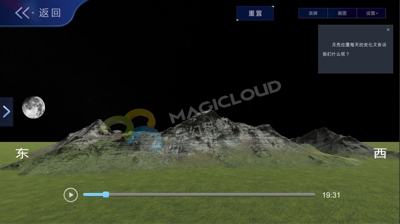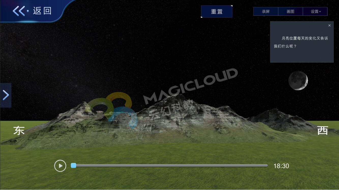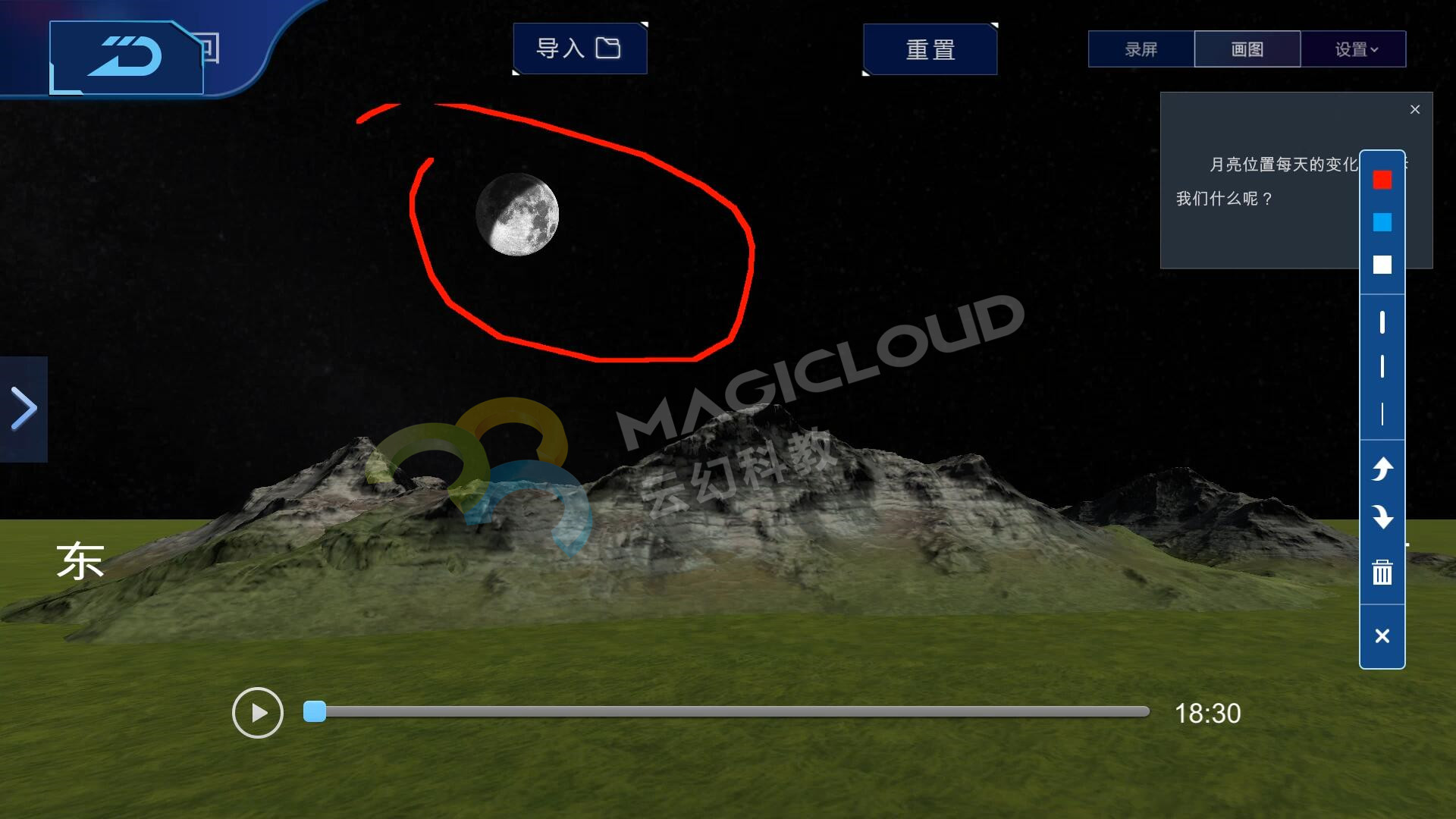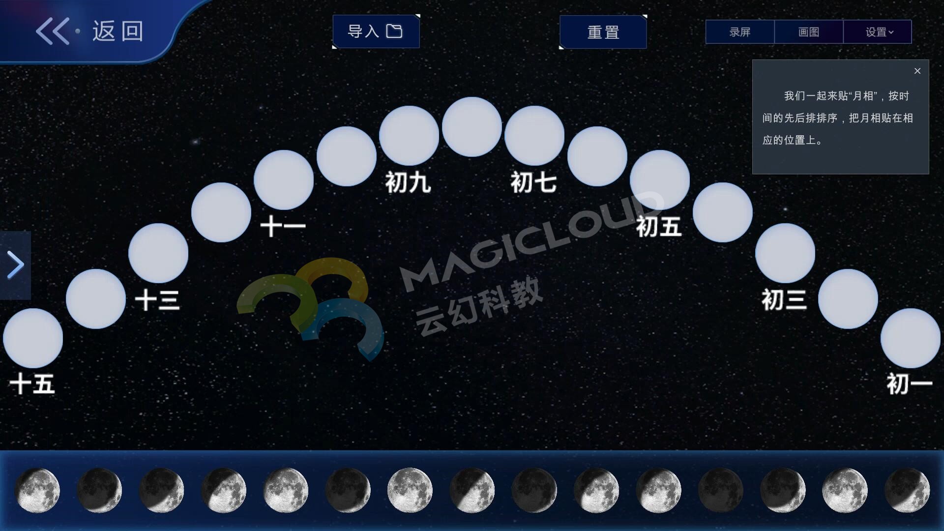 在常規(guī)教學(xué)中,一般教學(xué)環(huán)節(jié)為畫月相、給月相排序、模擬月相變化、觀察白天的月相等。教學(xué)環(huán)節(jié)中會遇到一些問題,如所畫月相是否正確、天氣影響無法觀察月相、觀察周期較長等等。云幻科教AR科學(xué)仿真實驗平臺可以融入常規(guī)課堂教學(xué)環(huán)節(jié),讓課堂教學(xué)變得更豐富、更有趣。