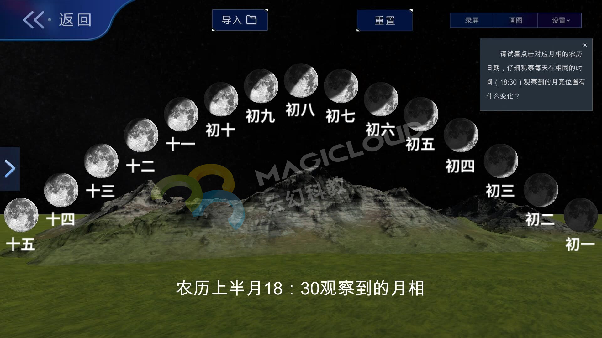 云幻科教AR科學(xué)仿真實驗平臺月相變化板塊設(shè)計分為月相變化的原因、給月相排序、探索月相變化、觀察晚上的月相、小試牛刀、拓展應(yīng)用六個板塊,在常規(guī)教學(xué)的基礎(chǔ)上進行擴充,全面覆蓋月相變化教學(xué)內(nèi)容,為教師教學(xué)提供豐富的素材。