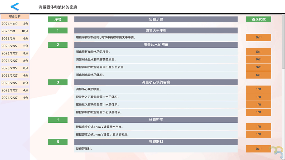 考試模塊按照真實初中理化生中考實驗內容制作,設置評分系統,當學生操作完實驗之后,系統會根據學生操作的每一個環節、每一步給出評分,評分詳情中展示學生的扣分項與得分項,同時通過AI數據分析,分數曲線,錯誤分布,得分詳情等多形式展示測試數據,輔助學生了解自己的不足之處。學生可以通過實驗結果分析自己的實驗操作過程,反復練習,保障實驗操作滿分完成。