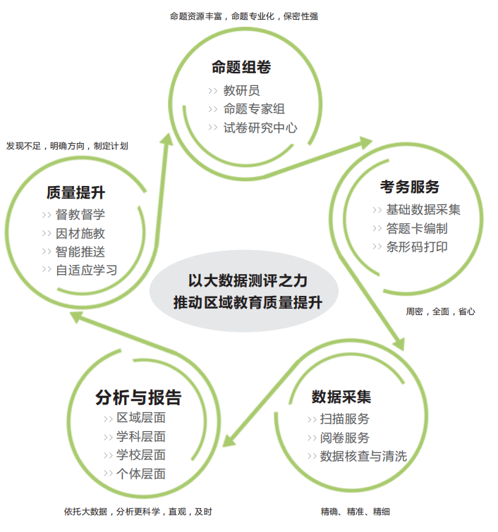 教育局 通過對區域考試數據進行全面采集,進而對數據進行深度挖掘與科學分析,最終自動生成適用于區域的不同層級、不同崗位用戶需求的個性化分析與診斷報告,并針對診斷結果智能推送相應的解決方案,以促進區域教育教學質量的全面提升,同時為區域教育改革與資源調整提供決策依據。