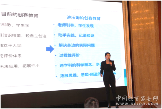 接下來王瑩對文香合作創客品牌迪樂姆做出講解,迪樂姆是專門針對0-12歲學生做的創客教育品牌,是一個系統的、培養學生發散性思維的創客教育。同時亮相的還有文香合作伙伴,和盛前沿工業機器人最新產品,在當前實業強國的大背景下,該款產品得到與會人員諸多青睞。