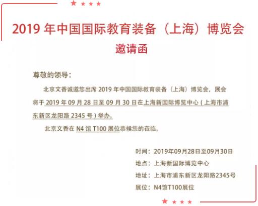 北京文香受邀參加2019年中國國際教育裝備(上海)博覽會,會議將于2019年9月28-30日在上海新國際博覽中心舉行。北京文香將攜超強陣容亮相本次展會。