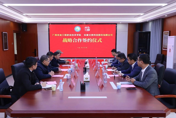 3月7日下午,文香與廣西農(nóng)業(yè)工程職業(yè)技術(shù)學(xué)院戰(zhàn)略合作簽約儀式隆重舉行。廣西農(nóng)業(yè)工程職業(yè)技術(shù)學(xué)院黨委書記馬敏,黨委副書記、校長(zhǎng)李振科,副校長(zhǎng)莫嘉凌,校教學(xué)科研處、人工智能學(xué)院負(fù)責(zé)人及相關(guān)教師參加儀式。文香董事長(zhǎng)朱玉榮、執(zhí)行總裁尚大強(qiáng)攜公司高管團(tuán)隊(duì)出席活動(dòng),雙方就深化產(chǎn)教融合、推動(dòng)智慧農(nóng)業(yè)人才培養(yǎng)等議題展開深入交流。