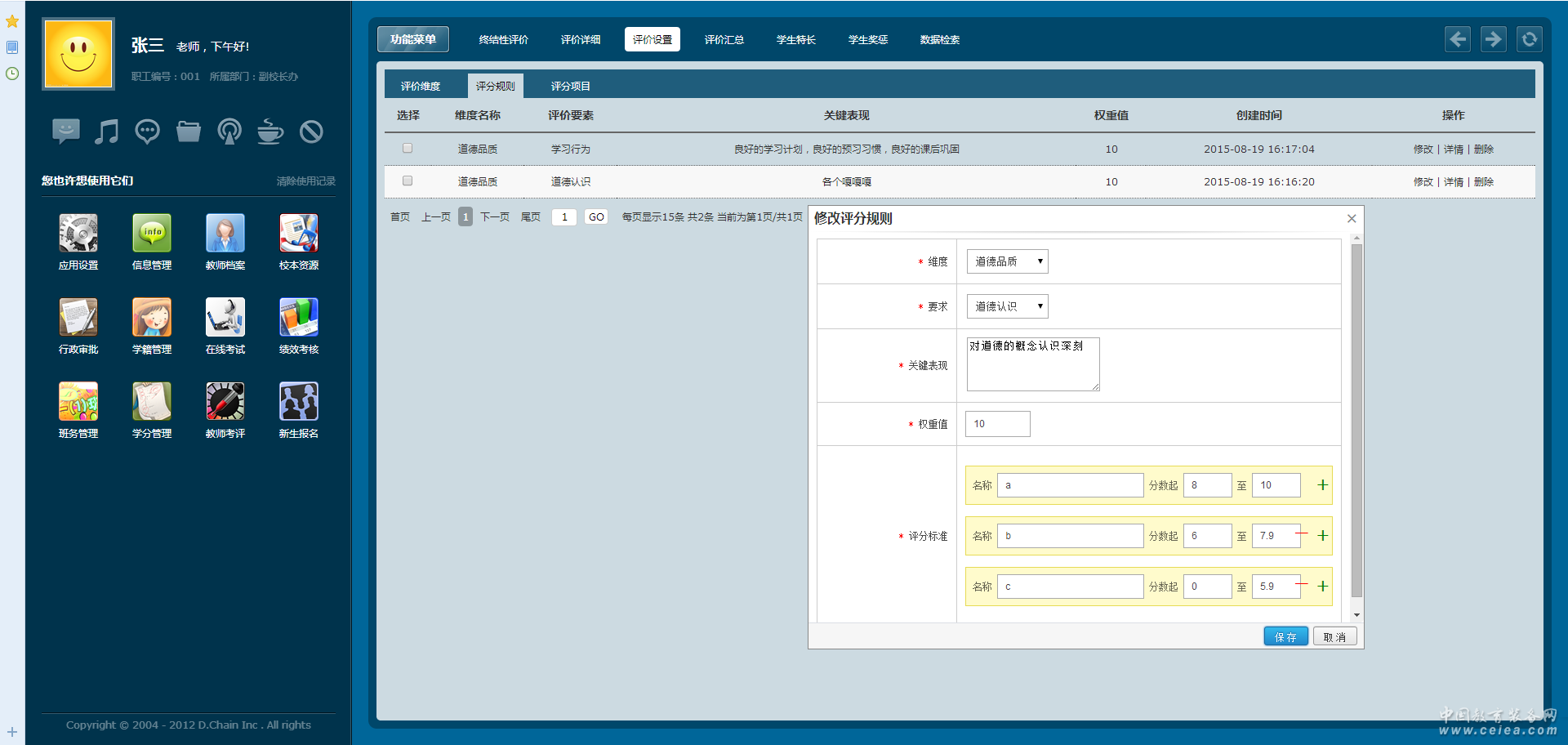 自定義評估維度 對維度信息的增刪改查,以及添加維度要素。 自定義評估細則 即細則設置中關鍵表現、權重值、評分標準與要素設置中的關聯。 自定義評估項目 評估項目的名稱、年度學期、開始結束時間、適用范圍,提取評估細則選擇等設置。 在線評估 評價小組的設置、對評價項目進行在線學生互評、學生自評、教師評、小組評、終極評價。 評估分析 評價考核項目生成最終每個學生評價分析報告,采用等級和分數的形式進行匯總展示,包含了當前評價考核名次的排序,同時生成相應的分析報告,在線打印和預覽。 學生特長 學生可以將每學期的特長情況進行相應登記,班主任也可錄入本班學生的特長情況。 學生獎懲 教師對學生的德育獎懲情況登記上傳,獎懲的登記也可以和評價項目進行關聯。 |