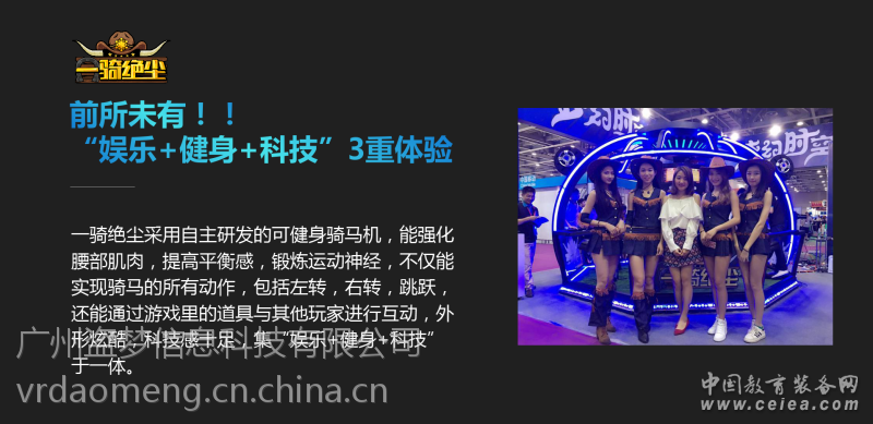 外觀:紅黑經典搭配,450CM*450M多邊形時尚設計,機身線路集成一體,內帶LED特效氛圍燈帶,冷軋鋼一體成型,全金屬噴漆,科技感、時尚感十足。 功能:運用Oculus CV1設備整體開發運營,空間定點定位,舒適坐墊,娛樂同時達到健身效果鍛煉腰部臀部。 內容:自主研發內容,頂級開發團隊,每個隔一兩個月發布一款更新內容,持續更新。 設計:固定式連接線,多邊形環式安全護欄,8人同時在線運行,體感感應騎馬搖晃、加速吹風、濺水等特效。 |
