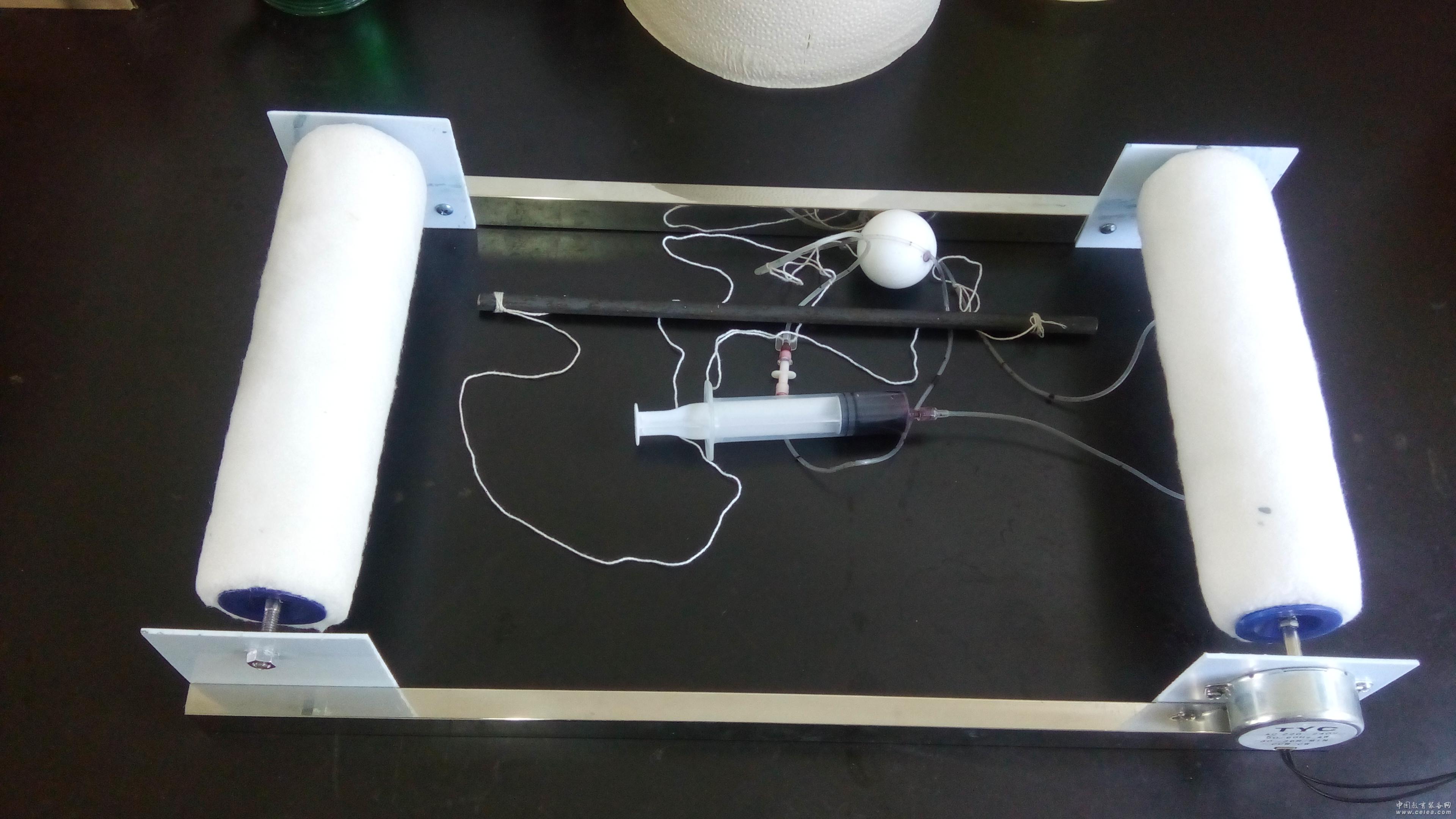 橡膠細管一端連接針頭,另一端與注射器相連,針頭插入擺球中心小孔內,注射器內注入墨水,推動注射器活塞,針頭噴出的墨水在紙帶上留下的墨跡,記錄下擺球的位置。當小球擺動時,墨跡記錄的就是擺球的位移,也就是位移坐標。