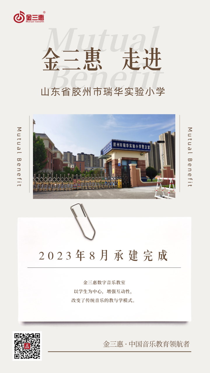 2023年8月,金三惠數字音樂教室走進山東省膠州市瑞華實驗小學,為學生提供了24+1的電鋼琴教室,配備了金三惠電鋼琴教學系統、電鋼琴、數字音樂教學儀等教學教具等。