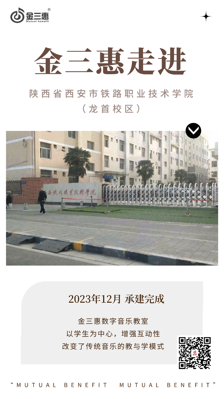 2023年12月,金三惠數字音樂教室為陜西省西安市鐵路職業技術學院(龍首校區)提供、安裝、培訓的常規學前教育專業實訓室正式開始使用!配備了金三惠教學系統、電鋼琴、數字音樂教學儀、學生樂器等教學教具。金三惠-數字音樂教室、音樂創作/教學/打譜軟件、音樂器材/教學裝備 (jinsanhui.com)