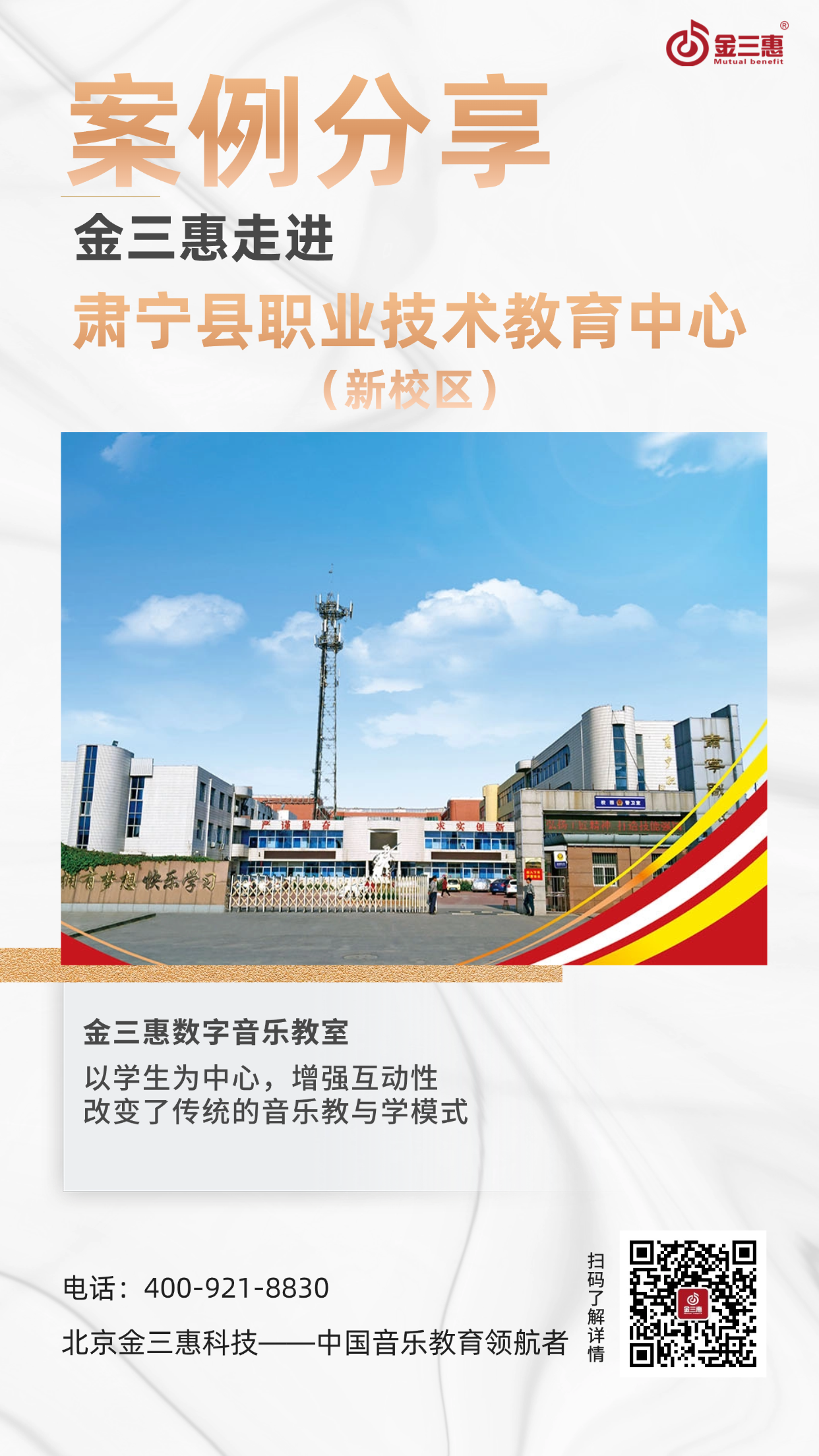 2025年11月,金三惠音樂教室走進(jìn)河北省肅寧縣職業(yè)技術(shù)教育中心,為學(xué)校提供了40+1的電鋼琴教室,配備了金三惠電鋼琴教學(xué)系統(tǒng)、電鋼琴、數(shù)字音樂教學(xué)儀等教學(xué)教具。