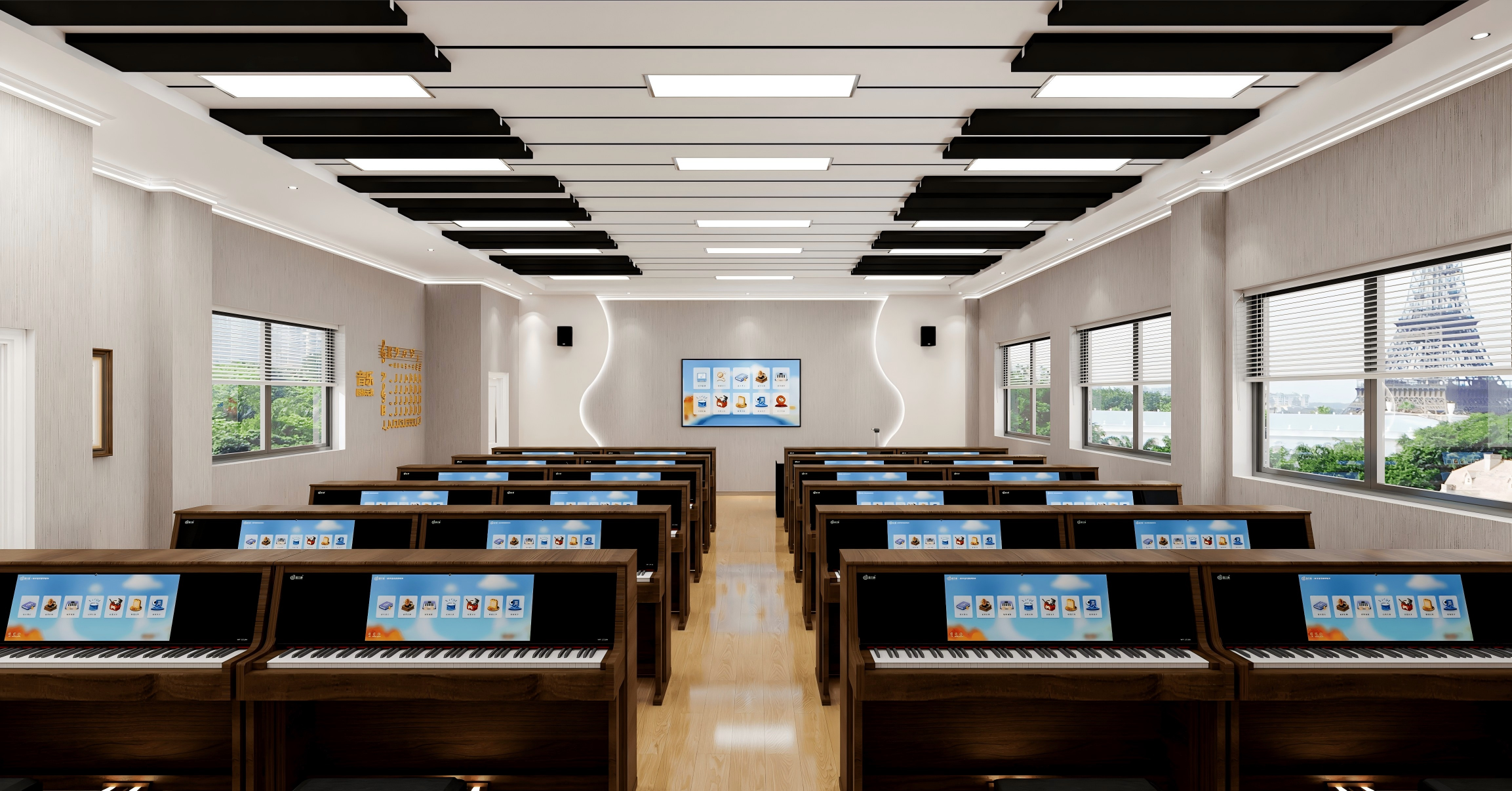 ●以全面提升學生音樂素養為目標,以智慧電鋼琴為載體搭載數字音樂教學系統,實現學生審美感知、藝術表現、創意實踐、文化理解的全面發展,將核心素養的培養貫穿始終,實現教、學、練、考綜合一體化的智慧音樂素養教室。