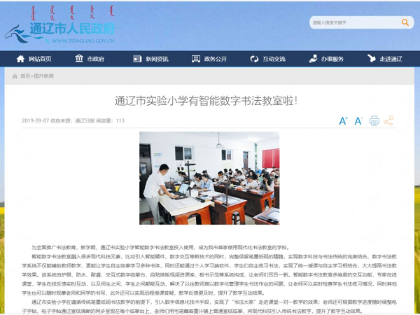 為全面推廣書法教育,2020年1月,內(nèi)蒙古通遼市實(shí)驗(yàn)小學(xué)智能數(shù)字書法教室投入使用并對學(xué)校老師進(jìn)行培訓(xùn)。據(jù)《通遼日報(bào)》報(bào)道,該小學(xué)是全市首家使用現(xiàn)代化書法教室的學(xué)校。