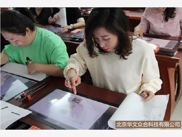 培訓(xùn)過程中,講師通過華文眾合智慧書法教室的多維互動系統(tǒng)與直播系統(tǒng),將書寫示范與其中一位老師的書寫過程,高清同步到每位老師面前的交互式數(shù)字臨摹臺上,并在電腦上現(xiàn)場進(jìn)行圈點(diǎn)、評價(jià)。在臨摹臺上,老師們用毛筆蘸著墨汁,鋪上普通宣紙就可以進(jìn)行書寫,防水、耐磨、自適應(yīng)調(diào)節(jié)亮度的交互式數(shù)字臨摹臺讓老師們眼前一亮。