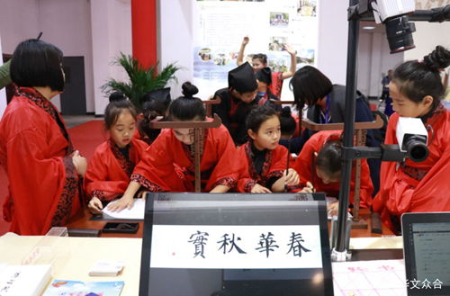 在科博會現場,華文眾合的智慧書法教室展位格外引人注目。古色古香又不失科技感的教室吸引大量觀眾駐足參觀體驗,更有身著古裝的小朋友在華文眾合展位練習書法,興趣十足。