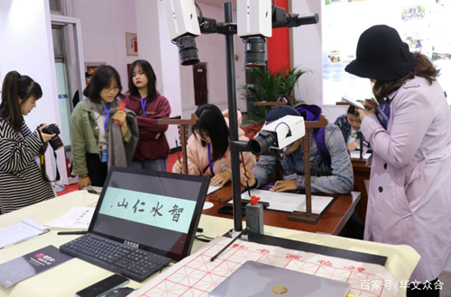此次科博會,華文眾合展示了歷經多次迭代的智慧書法教室。歷時多年自主研發設計的交互式數字臨摹臺,將普通宣紙直接覆蓋在上面就可實現高清臨摹,且保留傳統的筆、墨、紙的書寫體驗,解決了書法臨摹的難題;教學直播系統可以將教師的書寫示范實時高清地同步傳輸到每一位學生的交互式數字臨摹臺上,學生可以直觀地觀看教師書寫的過程,解決了一對一教學示范與課堂教學效率不高的難題。