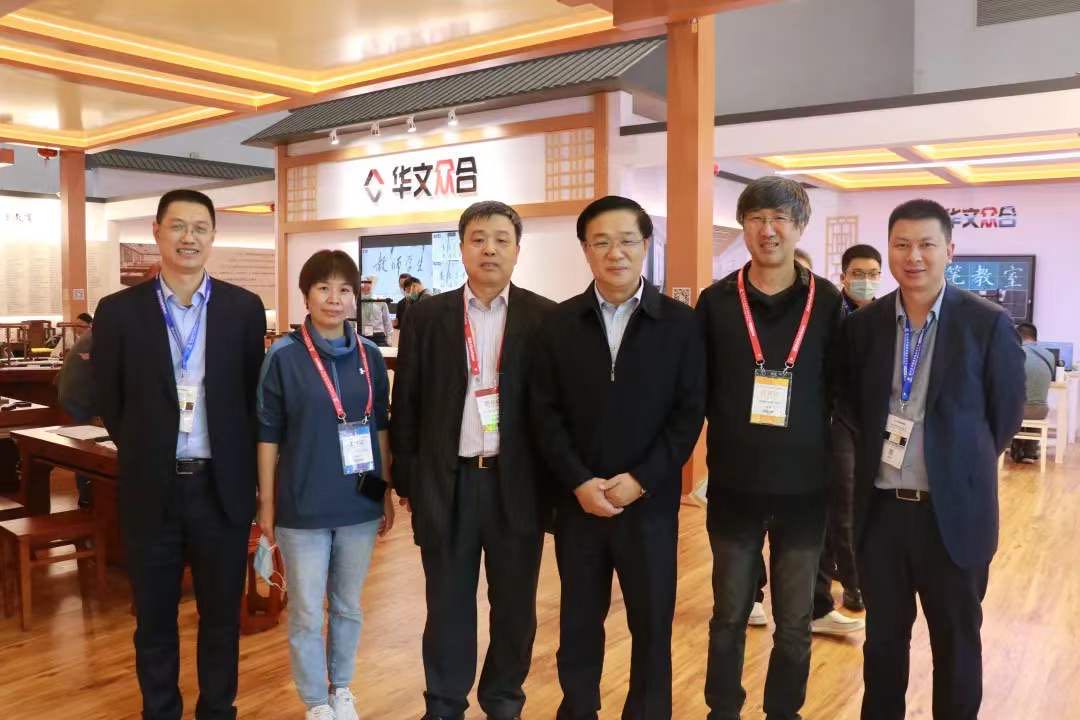 中國教育裝備行業協會副會長夏國明(右三)、北京市教育裝備行業協會會長柴旭津(左三)、華文眾合董事長向大鳳(左一)合影
