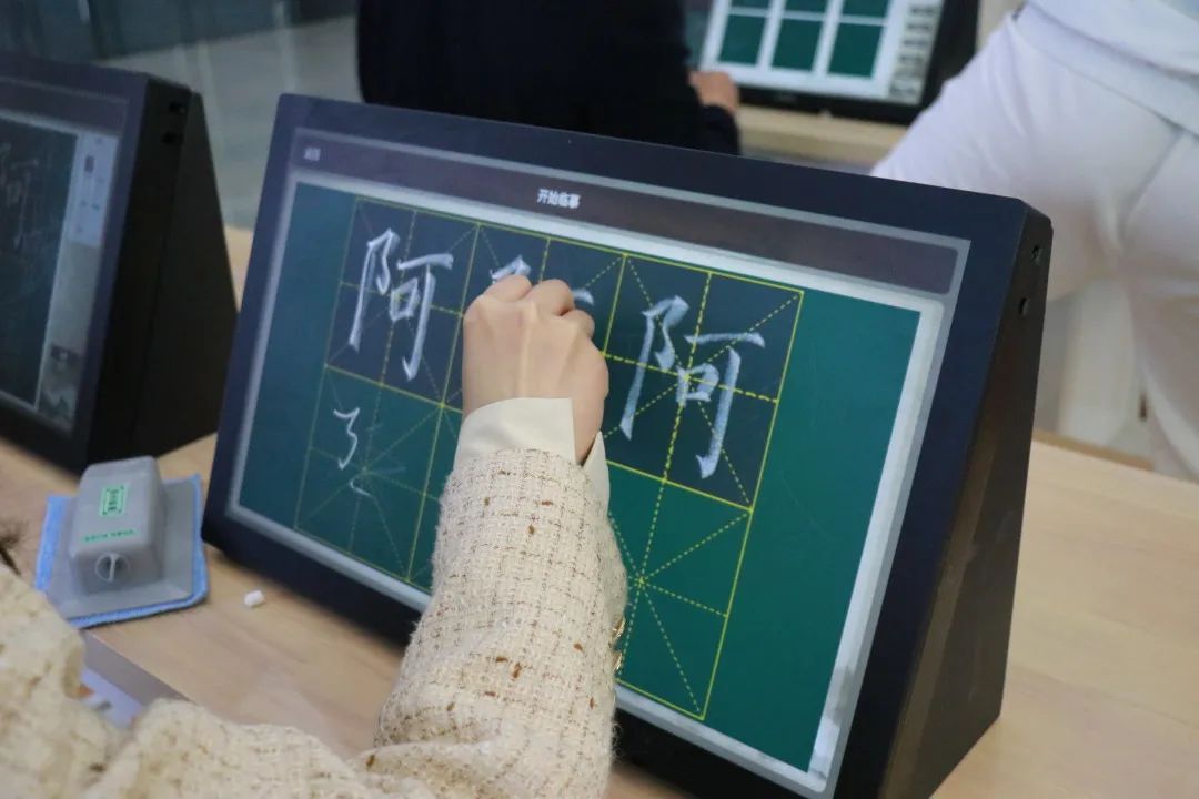 華文眾合全國首創(chuàng)推出的智慧粉筆教室結(jié)合歷代智慧書法教室的亮點,針對國內(nèi)師范院校的三筆字教學(xué)需求,還原了“老師在講臺授課、學(xué)生在座位上學(xué)習(xí)”的常規(guī)課堂場景;通過交互式粉筆臨摹臺的專利技術(shù),讓學(xué)生用普通粉筆即可直接在臨摹屏上書寫,還原了粉筆書寫的體驗。