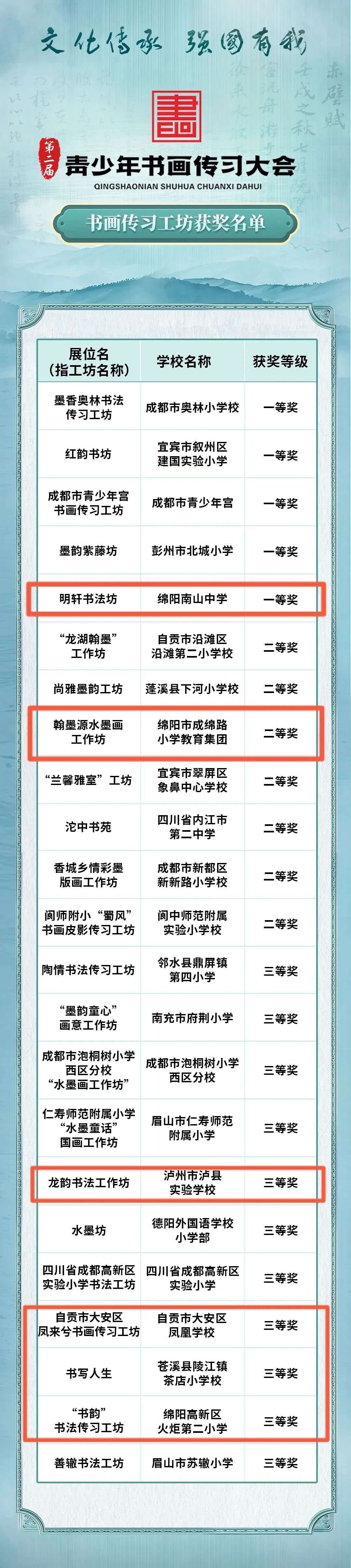 經(jīng)過激烈的比賽和緊鑼密鼓、嚴謹公正的評審,第二屆青少年書畫傳習大會全省決賽獲獎名單公布!其中書畫傳習工坊獲獎名單中,華文眾合眾多案例校榜上有名!