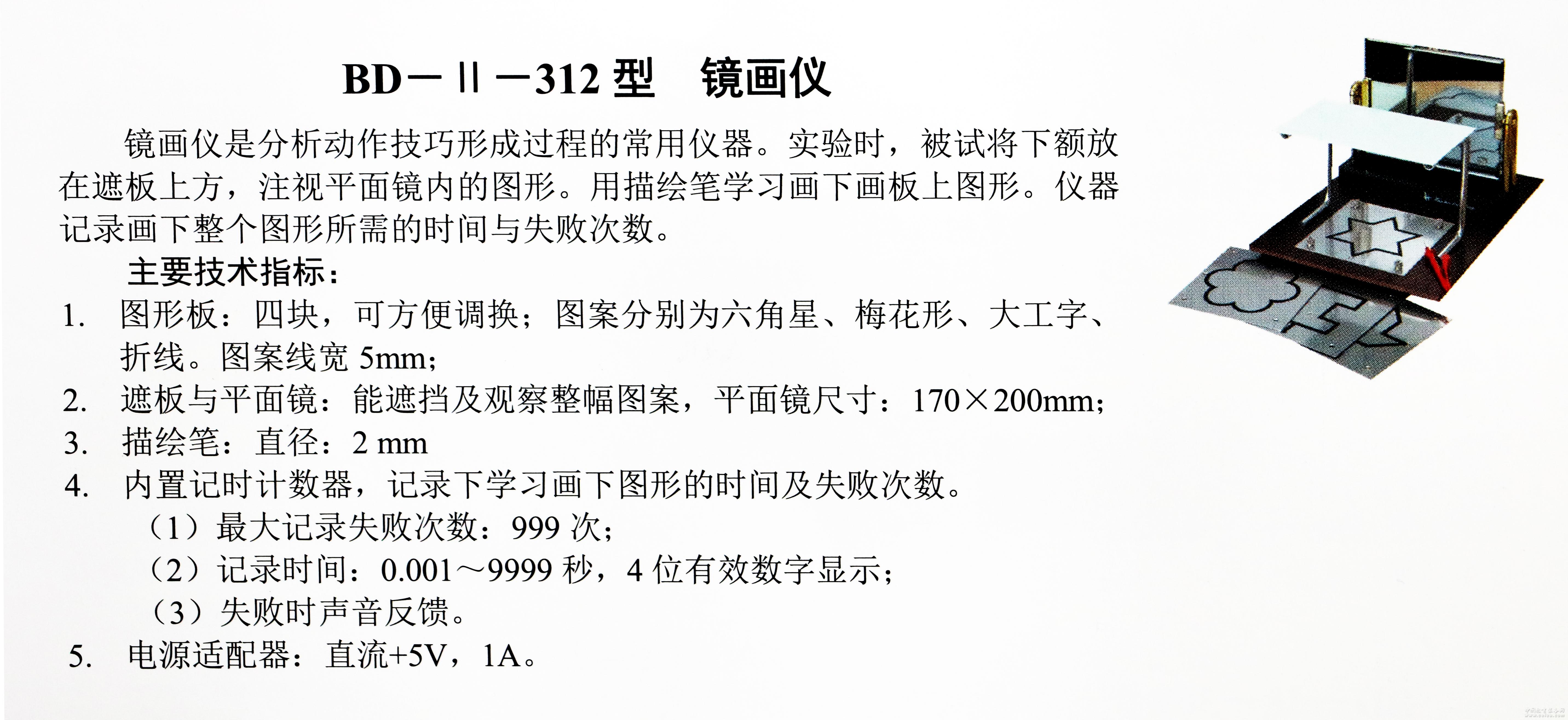 產品詳細介紹分析動作技巧形成的過程,比較用優勢手學習鏡畫的熟練程度不同時,對非優勢手的遷移效果。⒈圖形板:圖案為六角星、梅花形、大工字、折線共四塊,可方便調換;⒉遮板與平面鏡:能遮擋及觀察整副圖案。平面鏡尺寸:170×200mm;帶定時記時計數器。⒊描繪筆:直徑2mm。
