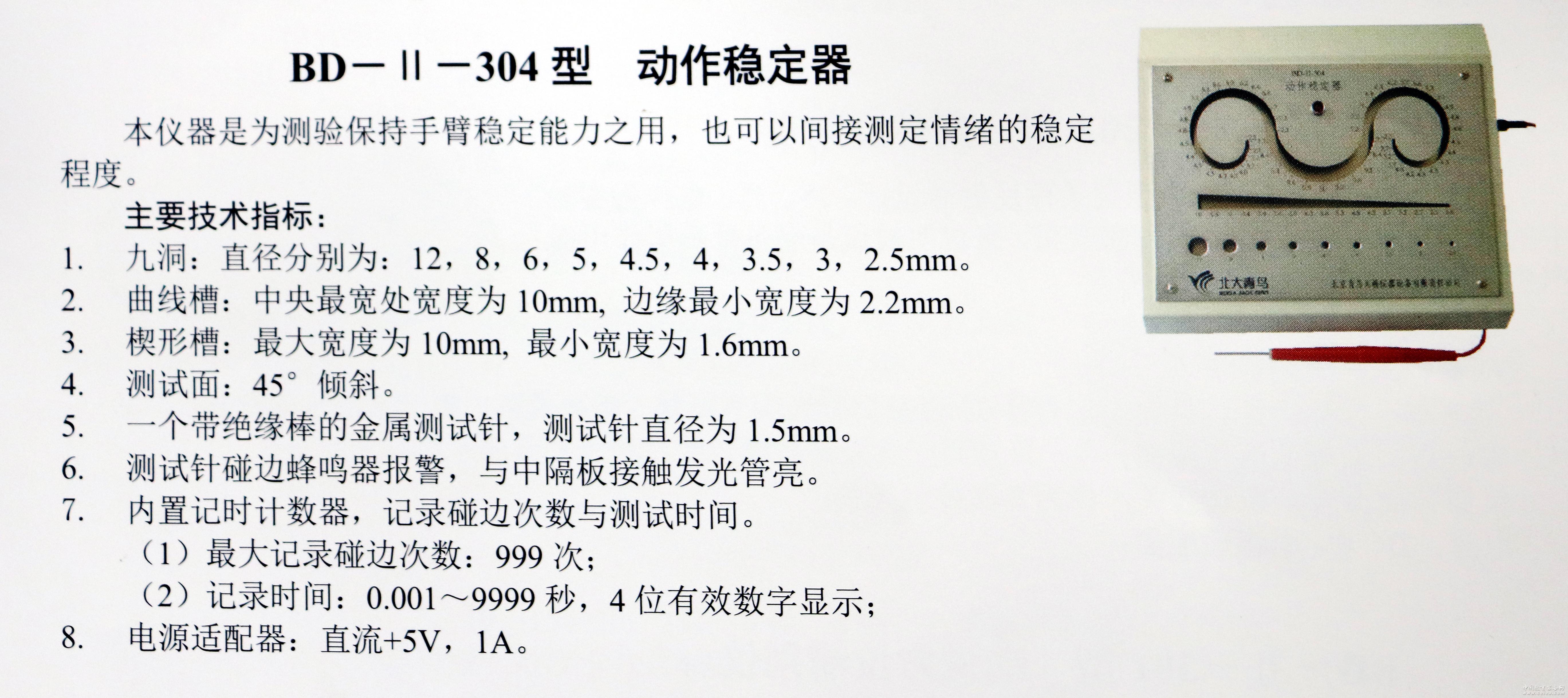 產品詳細介紹測試保持手臂穩定的能力,可間接測量被試情緒的穩定程度。⒈九洞直徑分別為2.5,3,3.5,4,4.5,5,6,8,12mm。⒉曲線槽中央最寬處寬度為:10mm,邊緣最小寬度2.2mm、⒊楔形槽最大寬度為:10mm,最小寬度1.6mm、⒋測試針直徑1.5mm,帶接計數器的插座。⒌DC 6V電源適配器。