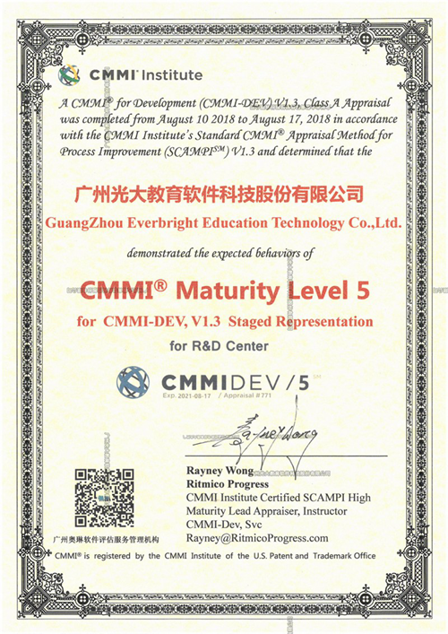 此次CMMI 5評估認證的順利通過,不僅證明了光大教育在軟件研發標準化、規范化方面表現優異,也標志著光大教育在過程組織能力、軟件研發能力、質量管理水平等方面均達到了國際一流水平。