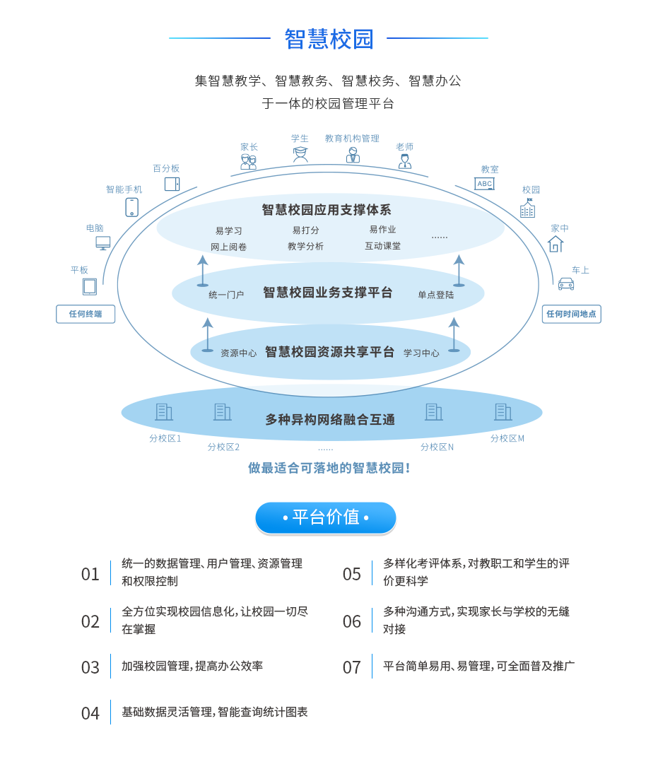 智慧校園是集智慧教學、智慧教務、智慧校務、智慧辦公于一體的校園管理平臺。平臺價值: 統一的數據管理、用戶管理、資源管理和權限控制全方位實現校園信息化,讓校園一切盡在掌握 加強校園管理,提高辦公效率基礎數據靈活管理,智能查詢統計圖表多樣化考評體系,對教職工和學生的評價更科學 多種溝通方式,實現家長與學校的無縫對接平臺簡單易用、易管理,可全面普及推廣