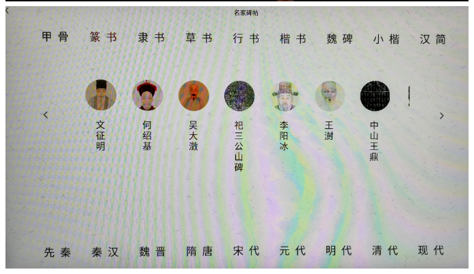 書法教學系統:先秦至近代高清碑帖資源放大或縮小,摹帖按年代、書體、作者自由檢索;內置書法文化知識,書法發展簡史、歷代作品賞析、歷代書論、書法家故事;字帖排版、字帖檢索、視頻展現、動畫演示、單鉤雙鉤的轉換、書體混排、格數變換、一鍵推送推送至學生端臨摹屏;學生作品展示、圈注點評、保存記錄、對照;集字功能,橫排、豎排、扇面、斗方、條幅一鍵推送至學生端實現集字創作和臨摹。