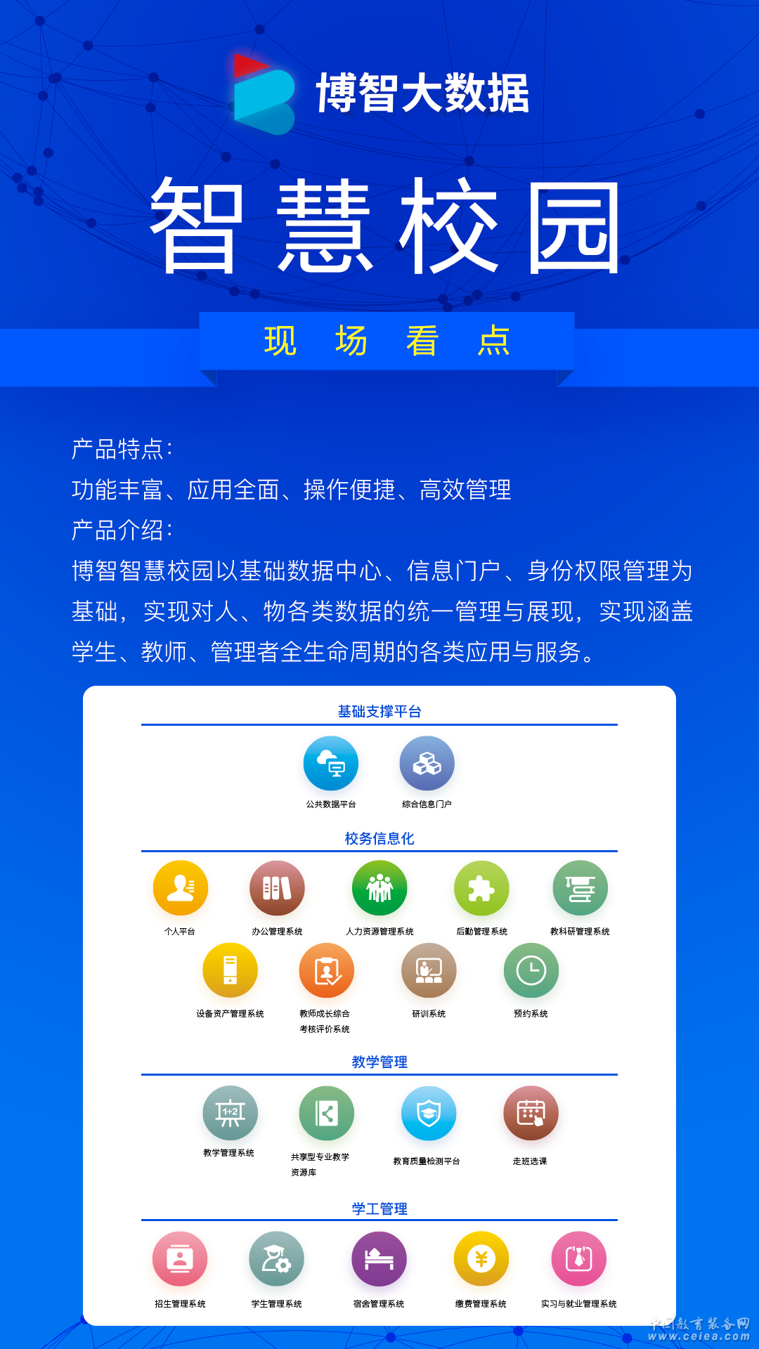 產(chǎn)品詳細(xì)介紹博智智慧校園,該產(chǎn)品功能豐富、應(yīng)用全面、使用簡單、管理高效,涵蓋了綜合信息門戶,辦公管理系統(tǒng)、人力資源管理系統(tǒng),后勤管理系統(tǒng),教科研管理系統(tǒng),設(shè)備資產(chǎn)管理系統(tǒng),教師成長綜合考核評價系統(tǒng),教學(xué)管理系統(tǒng),共享型專業(yè)數(shù)據(jù)資源,招生管理系統(tǒng),學(xué)生管理系統(tǒng),宿舍管理系統(tǒng),繳費管理系統(tǒng),實習(xí)與就業(yè)管理系統(tǒng)。
