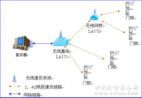 無線物聯(lián)網(wǎng)智能鎖集中管理系統(tǒng)的通信網(wǎng)絡(luò)分兩部分:無線通信網(wǎng)絡(luò)和有線通信網(wǎng)絡(luò)。 門鎖與無線基站之間是通過無線信號進(jìn)行通信的,無線基站與管理軟件之間是通過有線以太局域網(wǎng)通信的。 一般每個樓層可組成一個無線通信網(wǎng)絡(luò)。其中有一個無線基站,若干個無線網(wǎng)橋,及數(shù)量比較多的無線聯(lián)網(wǎng)門鎖。無線網(wǎng)絡(luò)是由無線基站創(chuàng)建,無線網(wǎng)橋和無線門鎖以就近原則自動路由加入。