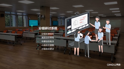 首先,青鹿高校智慧教室整體解決方案中的分組研討系統支持分組投屏探究,可輕松實現畫面動態預覽、中屏動態批注、小組自主錄制、小組自主研討等功能。
