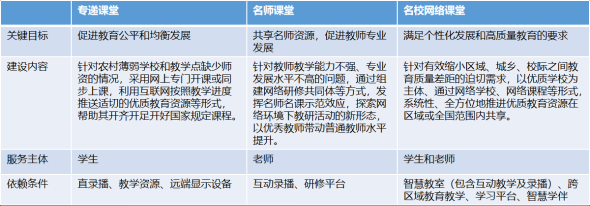 名校網絡課堂 :強調開放性,主要針對有效縮小區域、城鄉、校際之間教育質量差距的迫切需求。