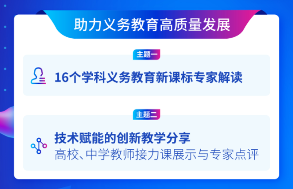 此次活動邀請了課標專家對16個學科義務(wù)教育新課標進行了解讀,并通過高校、中學教師接力課的形式展示技術(shù)賦能的創(chuàng)新教學,與廣大中小學校及教師分享政策解讀前沿觀點、信息技術(shù)賦能教學的創(chuàng)新應用。