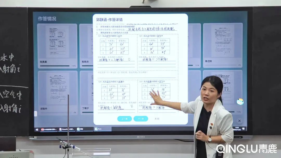 華南師范大學附屬中學的呂詩暖老師帶來的是一節物理新授課《光的折射》,呈現了一節以即時反饋為創新亮點的智慧紙筆教學課堂。上課伊始,呂老師帶領同學們對上節課的作業進行回顧與復習,針對班級共性錯題進行講解,高效鞏固已學知識。