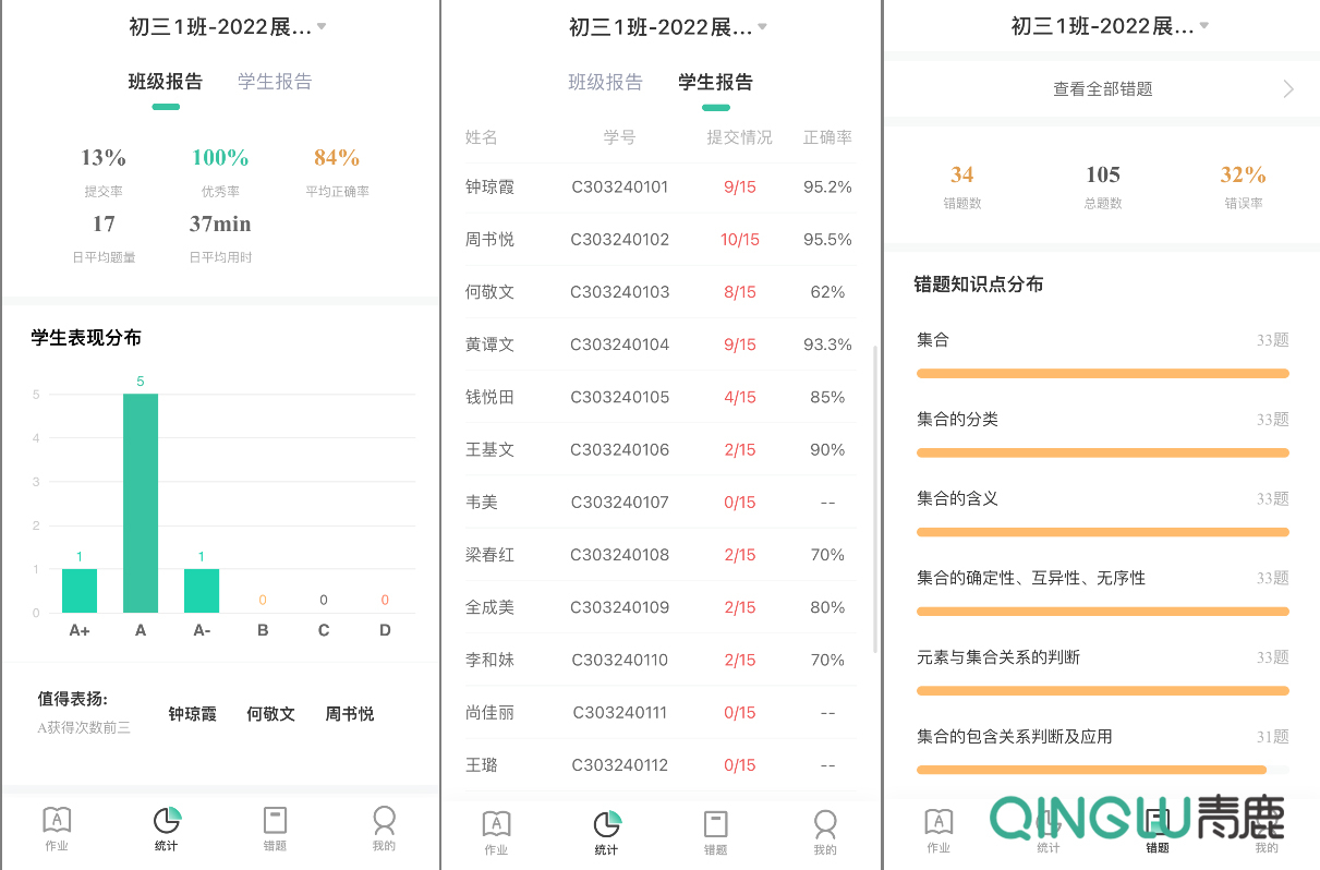 青鹿智慧作業(yè)能夠自動(dòng)生成多維度的作業(yè)數(shù)據(jù)分析報(bào)告,精準(zhǔn)反饋面向?qū)W生個(gè)體、班級(jí)、年級(jí)、學(xué)科等不同層次的典型作業(yè)特征,為教師打造高質(zhì)量“課前—課中—課后”教學(xué)閉環(huán)提供數(shù)據(jù)決策支持。
