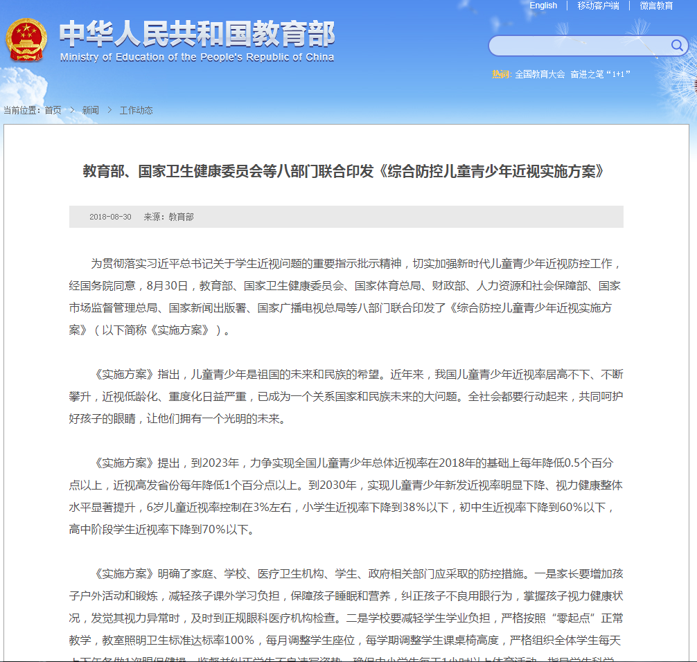 從2018年8月30日開始,兒童青少年近視防控就上升到國家戰略層面。八部委聯合發文,設定階段性的近視防控指標,將兒童青少年近視防控納入政府業績考核。