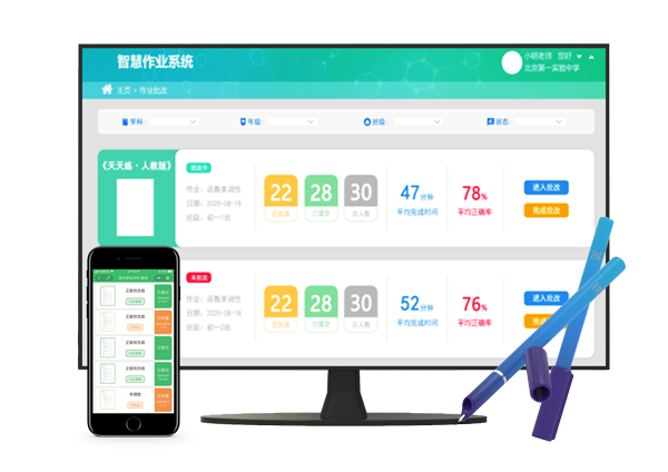 學生無需身處教室,可在任何地方用點陣筆書寫作業并在線提交,隨后老師即可在平臺上看到作業完成情況,并由系統自動批改客觀題,老師在線批改主觀題,批改后即刻生成成績報告,實現高效的教與學。