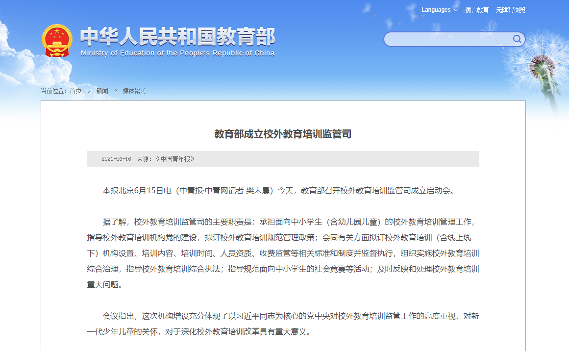 在3月底國務院新聞辦舉行的發布會上,教育部基礎教育司司長呂玉剛指出下一步將加大校外培訓機構治理力度。近日,教育部宣布成立校外教育培訓監管司,將負責擬訂校外教育培訓相關標準和制度并監督執行,反映和處理校外培訓重大問題。這一系列舉措體現了國家對整治校外培訓的決心,也將有力地規范校外培訓亂象。