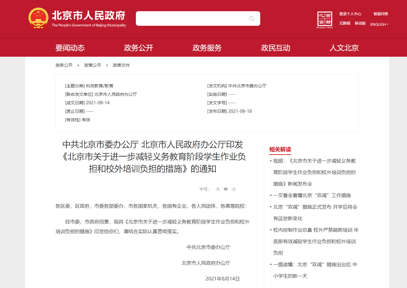 近日,《北京市關于進一步減輕義務教育階段學生作業負擔和校外培訓負擔的措施》正式發布。此前由中共中央辦公廳、國務院辦公廳印發的《關于進一步減輕義務教育階段學生作業負擔和校外培訓負擔的意見》,簡稱“雙減政策”,其中將北京市劃定為首批試點城市。因此,此次北京“雙減”政策的出臺,意味著“雙減”政策全面進入實操階段。
