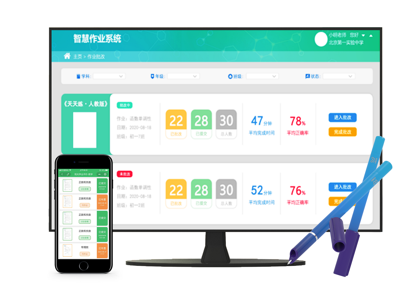 借助智慧作業,后臺可以完成自動批閱,幫助老師降低繁瑣的作業批改量,老師可以有更多的時間進行面批講解,提高作業的效果。同時,批閱后生成作業報告,學情及時反饋,幫助老師完善教學,以及開展精準教學。