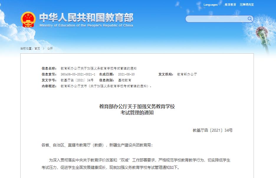 8月教育部印發《關于加強義務教育學�?荚嚬芾淼耐ㄖ罚岢隽藴蚀_把握考試功能、大幅壓減考試次數、規范考試命題管理、合理運用考試結果、完善學習過程評價、加強學業質量監測、健全管理監督機制等要求。