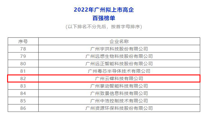 9月27日,在廣州市科學技術局的指導下,2022年廣州擬上市高企百強榜單發布會在廣州舉行。云蝶科技從全市一萬兩千多家高企中脫穎而出,榮登“2022年廣州擬上市高企百強榜單”。