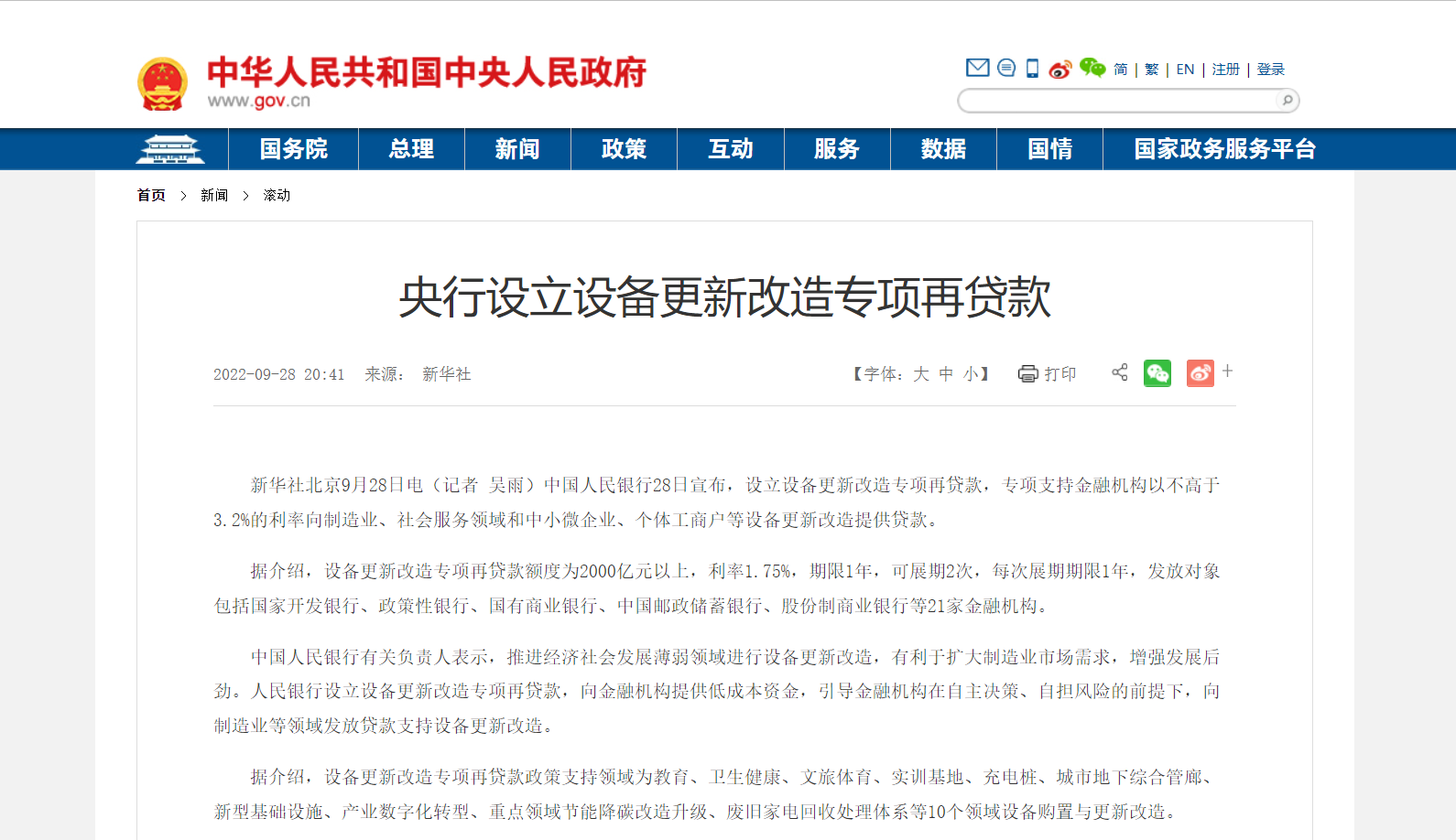 9月28日,中國人民銀行宣布設立設備更新改造專項再貸款,額度2000億元以上,支持金融機構以不高于3.2%的利率向教育、實訓基地、產業數字化轉型等10個領域的設備更新改造提供貸款。