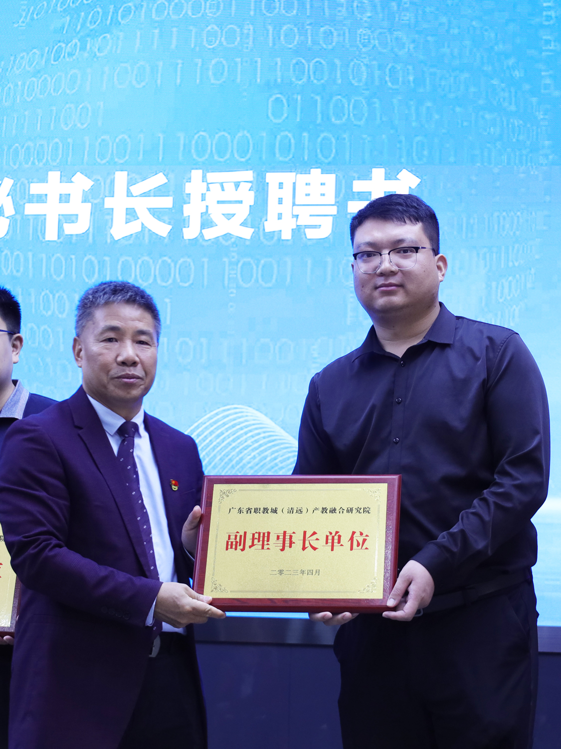 云蝶科技副總裁劉麗麗受邀出席,營銷中心副總經理霍天龍代表云蝶科技接受廣東省職教城(清遠)產教融合研究院副理事長單位授牌。