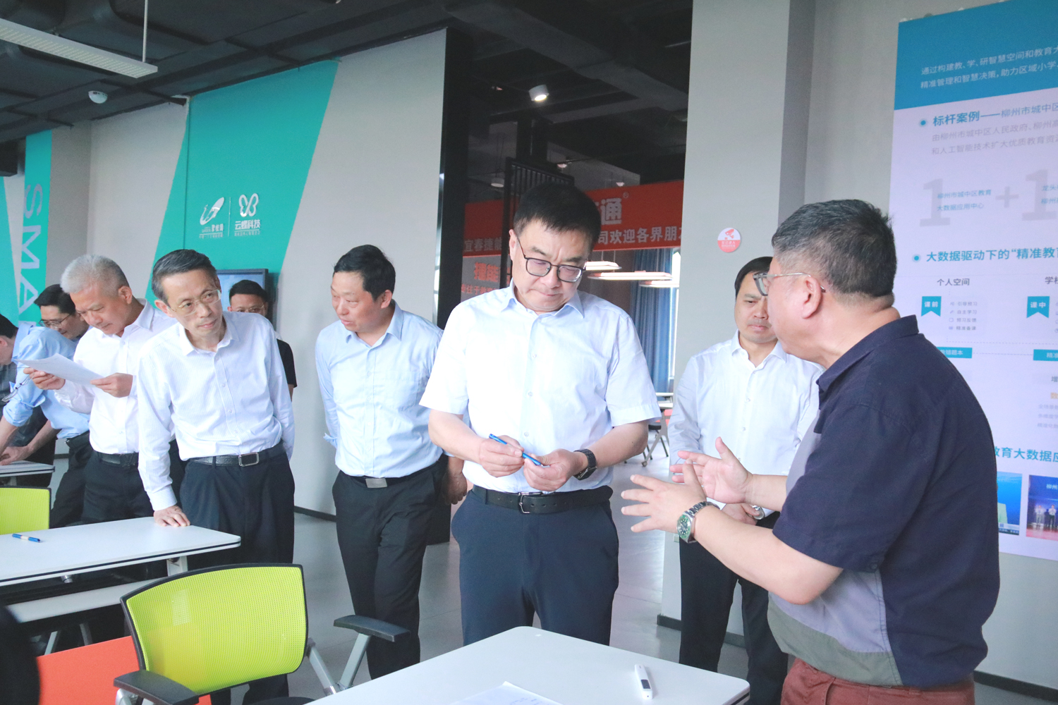 在中部教裝城,調研組一行來到云蝶科技展廳,認真聽取了云蝶區域教育大數據應用中心的建設情況,及云蝶智慧紙筆課堂的使用與成果匯報,肯定智慧紙筆在教育教學提質增效方面的效果。