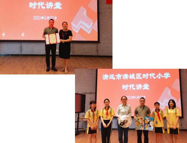 講座結束后,陳天博士還被聘為時代小學科技教育顧問,學生們在現場為陳天博士送上了精心準備的繪畫作品作為禮物。