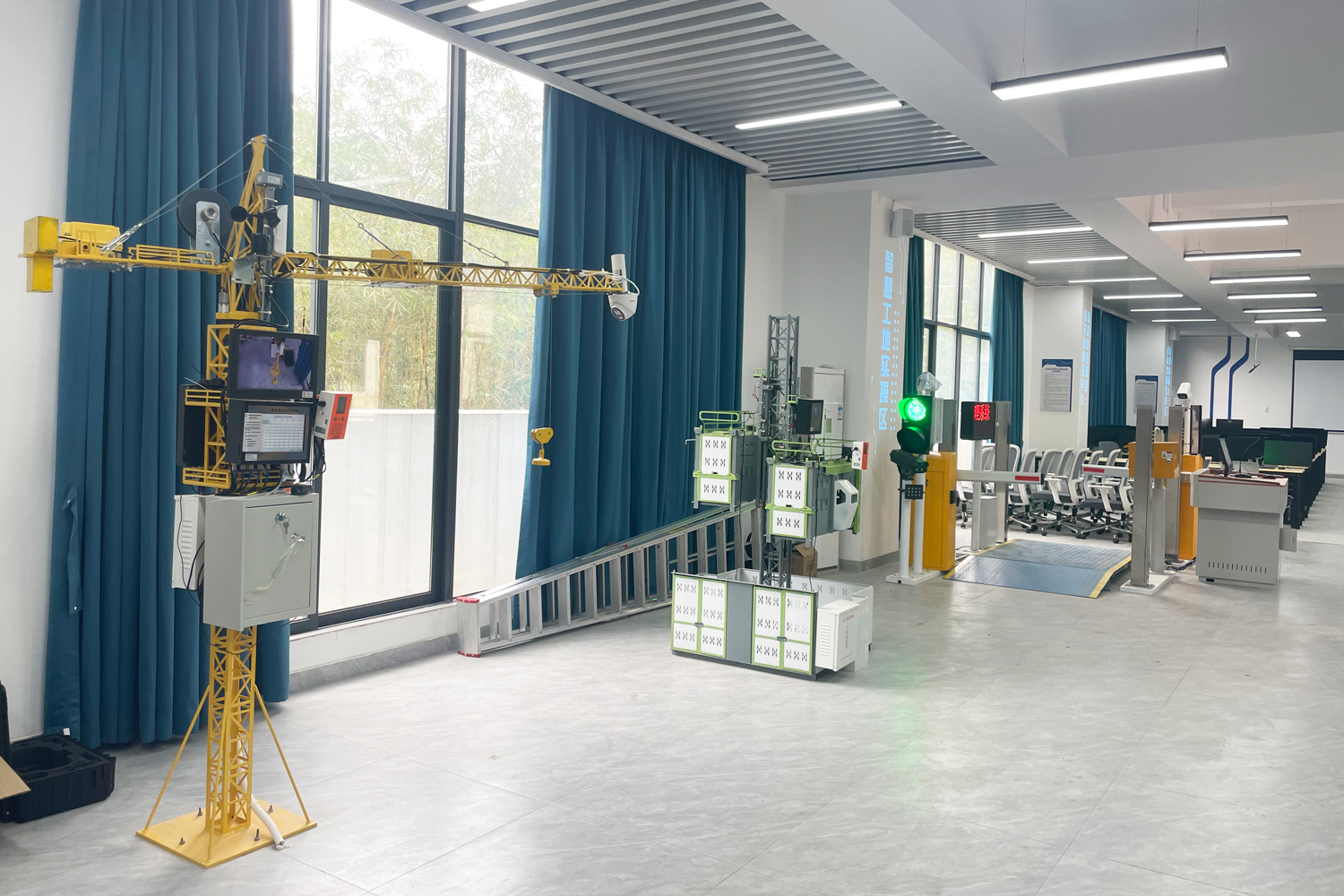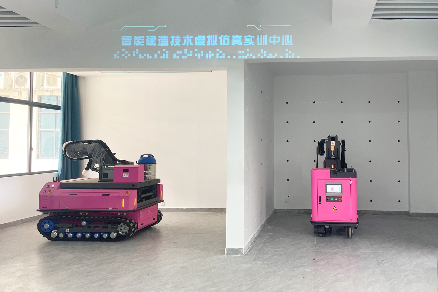 智能建造虛擬仿真實(shí)訓(xùn)中心隸屬學(xué)校建筑學(xué)院,實(shí)訓(xùn)中心內(nèi)設(shè)有智慧工地廣泛使用的測量機(jī)器人,打孔機(jī)器人,螺桿洞封堵機(jī)器人,以及智慧工地塔吊、升降機(jī)、閘機(jī)等模型,并搭載了BIM+機(jī)器人施工管理平臺系統(tǒng),可以對施工全生命周期進(jìn)行可視化監(jiān)測管理。