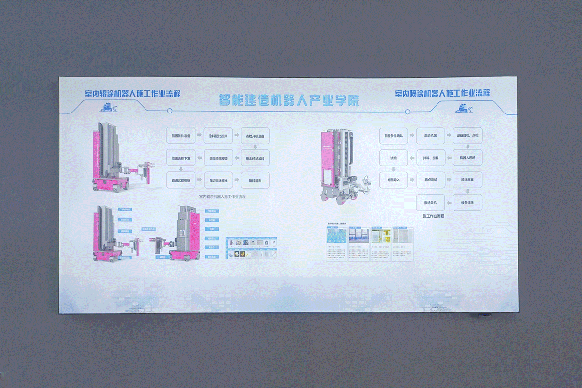 現場配備有室內噴涂機器人、測量機器人、地面抹平機器人、地面整平機器人、地坪研磨機器人等硬件設備與機器人工單協同平臺等軟件平臺,涵蓋多個施工階段。在軟硬件協同操作中,學生通過對機器人作業的自動規劃、多機協同,培養動手能力、實踐能力、創新能力,教學效果得到進一步增強。