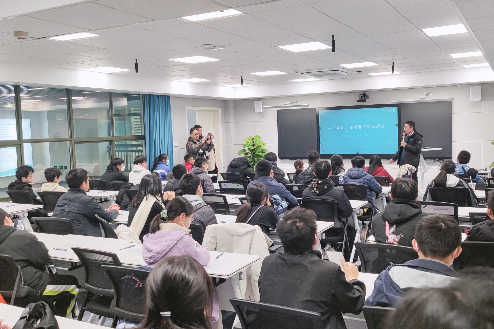 “無論世界如何變化,數智化是最確定的方向和機遇“。在科普講座環節,陳天博士以《人工智能,變革世界的新動力》為題,與學生們探討人工智能的發展趨勢,并結合相關案例,為學生們介紹人工智能在不同行業的創新應用。深入淺出的講解,開闊了學生們的視野,讓未來的“科學家”們收獲多多。